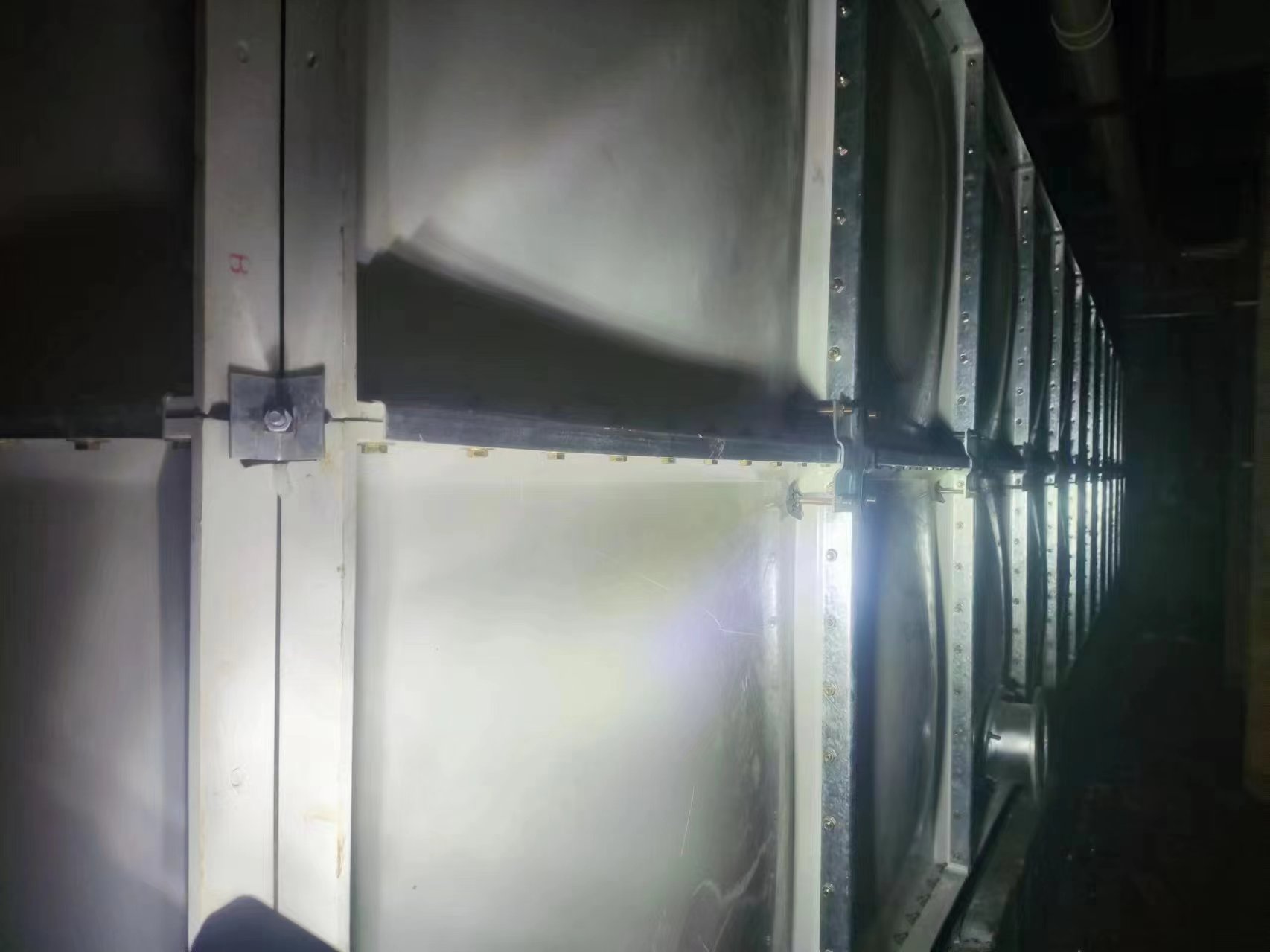 我司承接的內蒙古巴彥淖爾市瑞京名第地下室及樓頂消防水箱項目,已安裝試水完畢。SMC組合式玻璃鋼水箱是由整體優質的SMC水箱板拼裝而成。其特點是采用不飽和樹脂,因此水質好,清潔無污染;具有強度高,重量輕,耐腐蝕,外型美觀,使用壽命長,保養管理方便等特點。