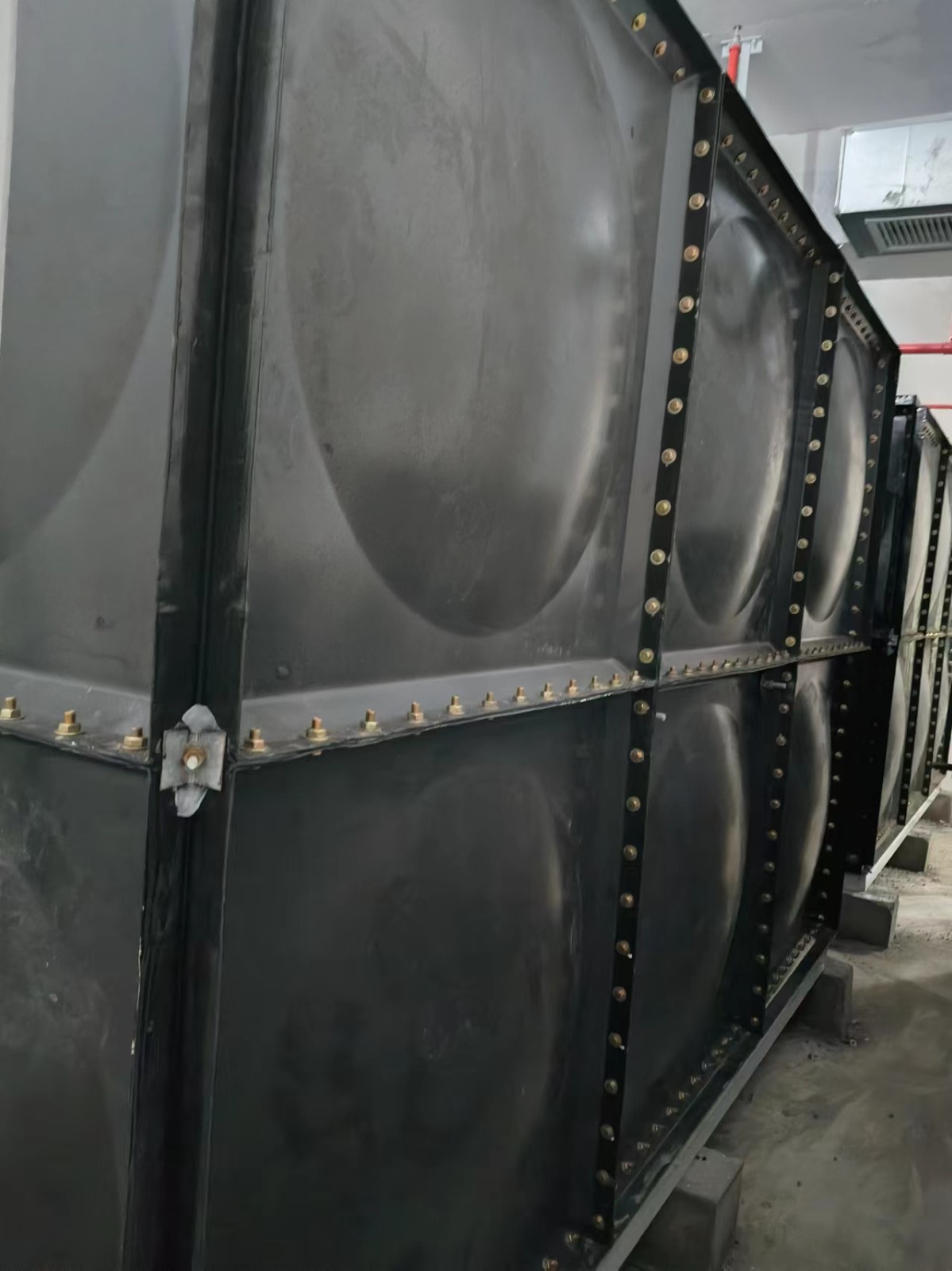 我司承接的江蘇常州市長寧區萬象城搪瓷鋼板油箱項目已安裝完成。裝配式式搪瓷鋼板儲油箱采用Q235鋼板,沖壓形成1000×1000和1000×500的標準塊,周邊鉆孔,經高溫燒結搪瓷處理,現場進行組裝,組裝時標準塊之間采用耐油膠墊密封,螺栓連接。
