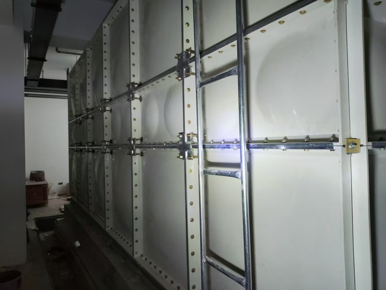 裝配式玻璃鋼水箱是一種普遍采用的儲水方式,由SMC單元板現場組裝而成的一種水箱。單元板用SMC(sheet moulding compound)片材在高溫高壓下模壓成型,內部采用加強式支撐,其配件選用熱鍍鋅件和不銹鋼件均可。板塊厚度的選取依據板塊所受的壓力和所處的位置。有5mm、8mm、10mm、12mm、14mm、16mm等。模壓成型的方式,增加了抗震、抗沖擊的強度,克服了手糊制品強度不均勻的缺點,提高了耐壓強度和使用壽命。無滲漏,無變形,保養、檢修方便;在有限的空間內存放和安裝,很容易擴大或更換,施工方便。